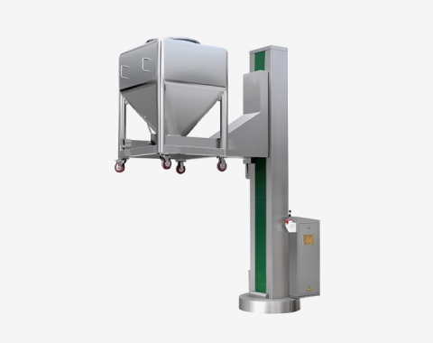 In the granulation process, dry granules are transferred into an IBC container for blending, facilitated by a dust-free connection. The IBC container is then seamlessly loaded into the blending mechanism. With a secure 15° incline and hydraulic lifting system, the IBC undergoes three-dimensional rotational blending to ensure a homogeneous mix. After blending, the same container is directly loaded over the tablet press hopper for discharge, streamlining the production workflow for maximum efficiency.